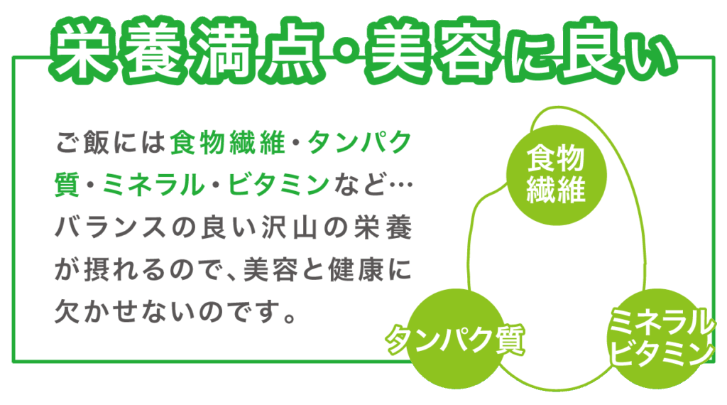 京都大学名誉教授の森谷敏夫先生によると、お米はダイエットや筋力アップにとても重要で科学的にもお米は太りにくく、人間が活動する上で必要な栄養素が含まれているといわれてます。1日に摂取するお米などの糖質のうち約70%は筋肉が、約20%は脳が消費します。つまり90%近い糖質のエネルギーが脳と筋肉で使われています。お米は、食物繊維・タンパク質・ミネラル・ビタミンなど…バランスの良い沢山の栄養が摂れ美容と健康に良いです。お米を抜くと筋肉低下などにも繋がるのでお米を食べることを推奨されてます。