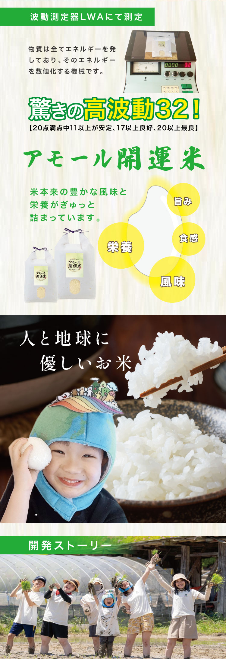 弊社は社会貢献の一環で農家さんのサポートをしております。 地球と人に優しい、安心できる高波動のアモール開運米を広め沢山の健康な人が増えればと願っております。