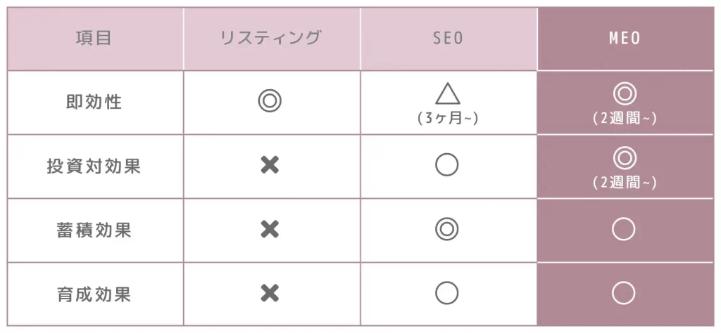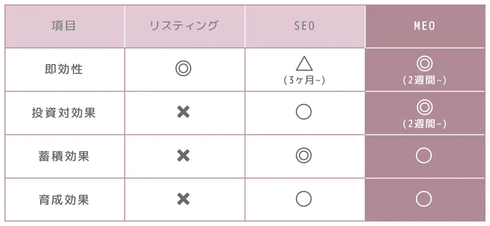 Map Engine Optimization SEOだけでは勝てない時代を MEOの活用で切り拓く 契約件数1,000件以上 1年以上の継続率95% スマートフォンの使用が当たり前のいま、 WEB集客もそれへの対応が必要とされています。 スマートフォンの検索は、GPSとの連携で 「今いるエリア」+「サービス名」での検索がデフォルトとなっています。 ただそれらSEO対策をしても、ホットペッパーなどのポータルサイトが上位表示され、導線としては弱いものとなってしまいます。しかしGoogleマップの表示は、それら検索結果より上に表示されます。それは、スムーズな導線となりこれからのWEB集客を切り拓く原動力となっています。 また図の様に、MEOは他のWEB集客に比べ、即効性、投資対効果に優れています。 さらに対策の効果も安定しており、対策した内容や効果を長期的な資産として保つことができます。 弊社ではMEOに関して、これまで蓄積してきた独自の技術とノウハウを持っています。 その技術とノウハウでMEOを強力に進め、あなたのお店や会社のWEB上での価値向上に貢献させていただきます。 POINT01 検索ワード 最大4ワードまでOK 業界最大!! POINT02 クチコミ 全て返信 POINT03 お店の 写真をアップ POINT04 お店の中の写真を 載せることによって 訪問数が上がる POINT05 概要、サービス(メニューなど)、写真、オーナー提供 ブログ的)、詳細などもきちんと全て掲載してく のでホームページ代わりに使える POINT06 サイテーション(Instagram、 facebook、Appleなどの20社 以上の外部アプリ)を入れている